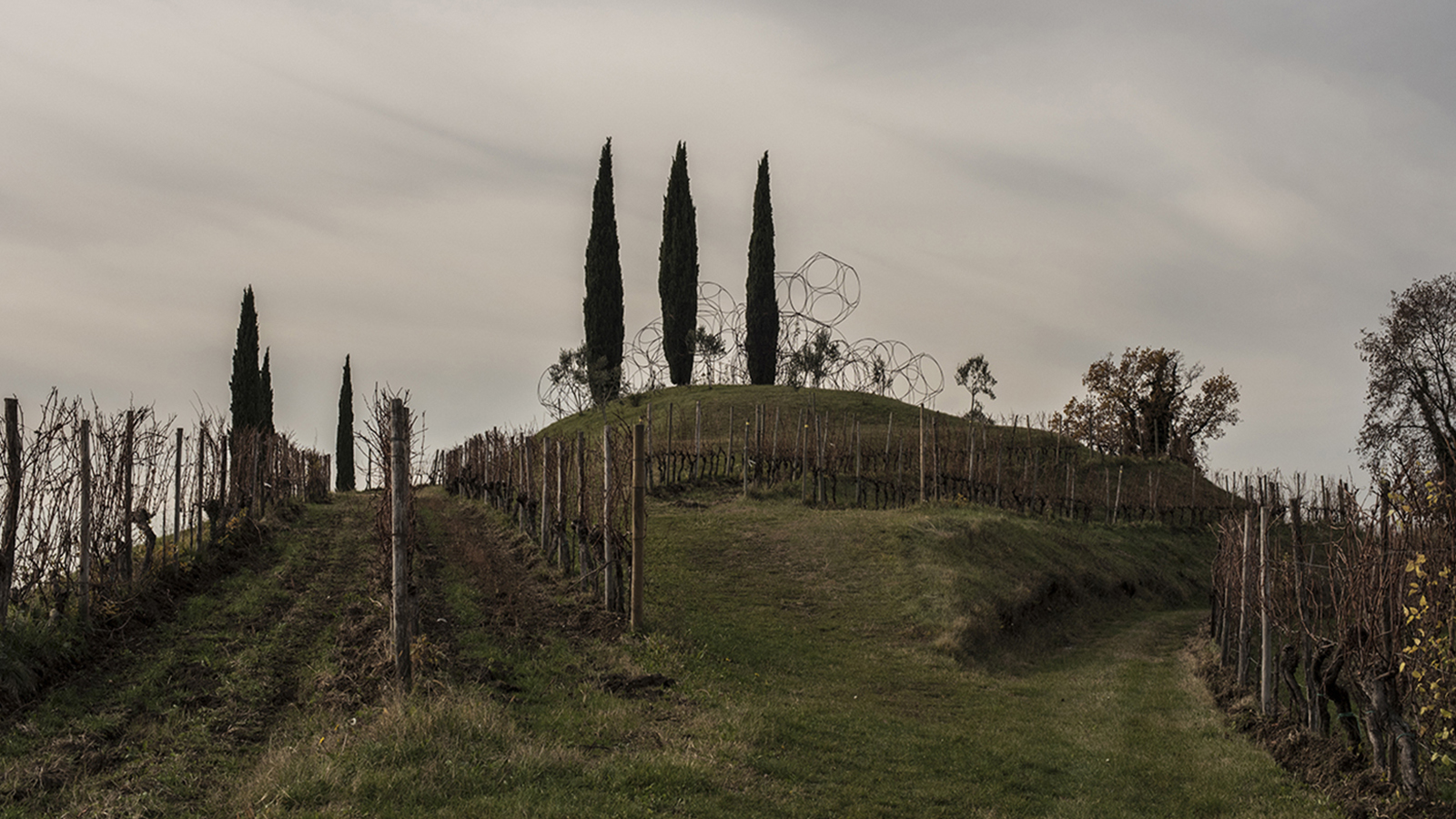 If you walk by Colli Orientali del Friuli, exactly at Rosazzo, you will find a light open air structure surrounded by the vineyards and made of 200 iron circles welded together with 100 little vines planted at the bottom of it.