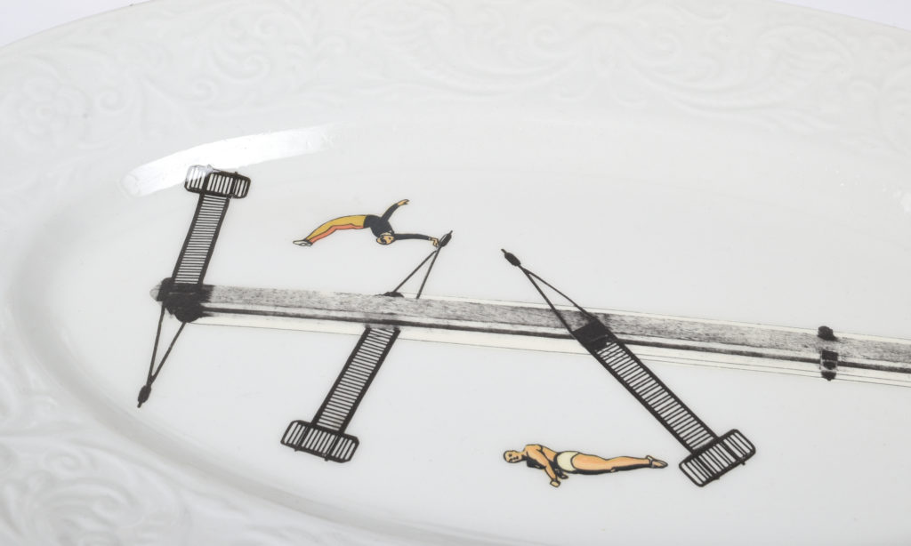 L’equilibro è sensazionale, le dimensioni dei piatti, la grazia dei disegni, gli animali scelti — mangiare su di un drago o un pesce istrice non è cosa di tutti i giorni — raccontano di una collezione inedita quanto capace di stare sulla tavola più convenzionale.
