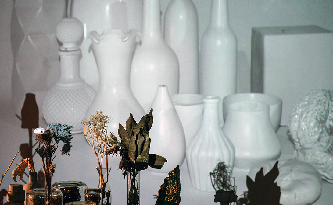 joins the body and its emotional sphere, through a collection of plants and tools related to my past: compositions created with the need to portray apparent tensions and paradoxical visual balances.