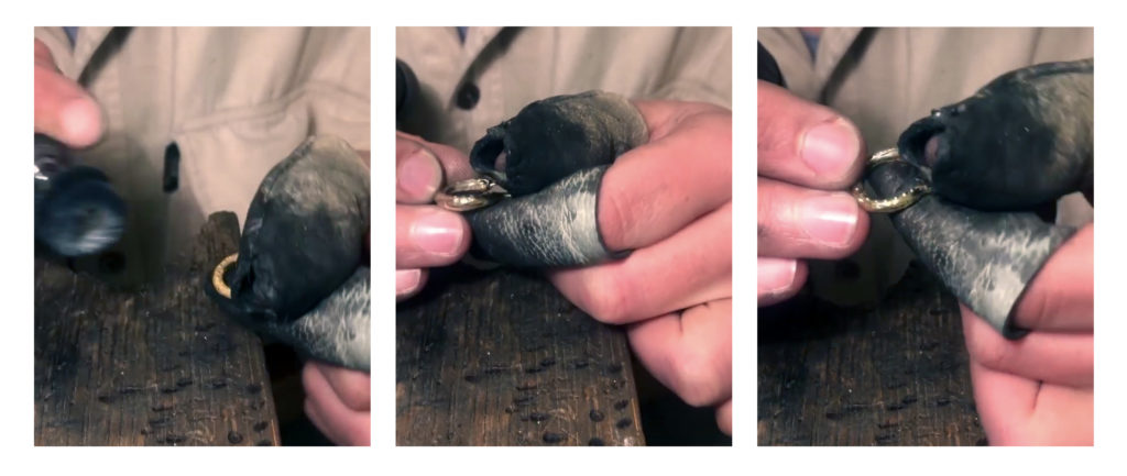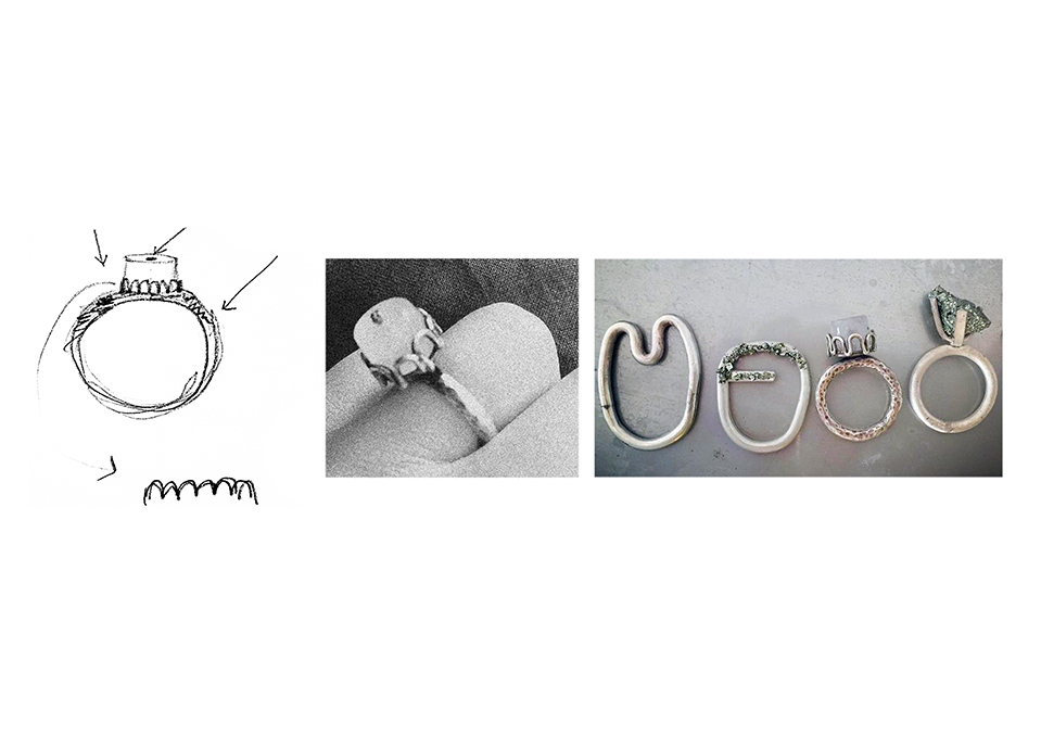 La scuola orafa mi ha insegnato molte cose, tra cui il disegno dei progetti, poi come succede spesso, si finisce per sovvertire le regole apprese in funzione di una ricerca funzionale al proprio modo di lavorare. Premesso che la mia filosofia etica non prevede l’idea di una produzione seriale e continua di oggetti, ogni anno realizzo una piccola produzione di pezzi unici che nascono sotto forma di mini collezioni. Nella maggior parte dei casi le mie collezioni nascono con un’idea precisa dell’estetica globale che voglio far emergere, quindi scrivo, disegno e prendo nota (sempre su carta!) per fissare alcuni dettagli, tecnici e non, che serviranno da guida nella realizzazione dei pezzi. La riflessione sul processo fatta in precedenza trova anche qui terreno fertile: mi eccita il fatto di non avere un’immagine precisa di come sarà il pezzo finito, è la materia stessa a parlare e dirigere le mie mani mentre la lavoro.