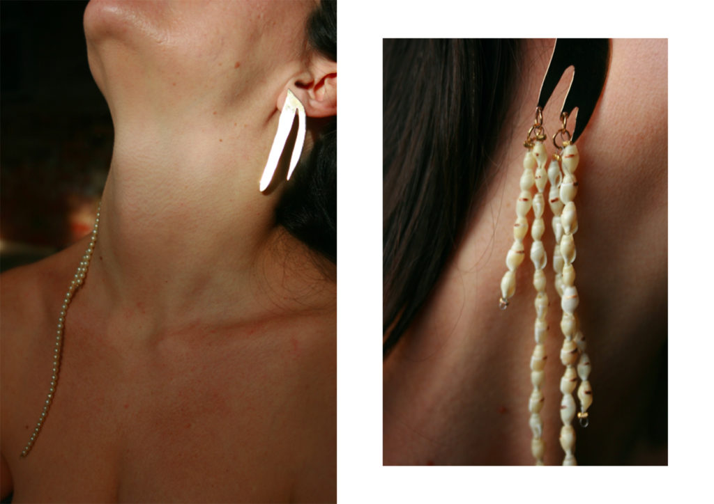 GV – Penso a SURI x A.C., la mia collaborazione con Alberto Cornolò, un brillante fashion designer emergente alla IUAV di Venezia, e riconosco chiaramente la scia che questa connessione ha lasciato nel mio lavoro. In quell’occasione ho realizzato due pezzi unici, una spilla ed un orecchino, per la collezione finale che Alberto ha presentato durante la Milano Fashion Week 2020. Dall’esperienza con questi gioielli è nata LUCE, una capsule di orecchini. Ogni pezzo è unico, tagliato a mano, finito con una texture dorata calda e luminosa. Al metallo si aggrappano cascate di perle d’acqua dolce, piccole perle rosa luminosissime oppure minuscole conchiglie. Il risultato è un inno alla luce di Venezia, alla sua sensualità e le sue contraddizioni. Ogni pezzo è unico e si adatta perfettamente a qualsiasi corpo. Ogni collaborazione necessita un confronto tra me e l’altro, da queste chiacchierate emergono intuizioni che bisogna saper ascoltare perchè spesso la loro forza si rivela dopo qualche tempo, ripresentandosi d’innanzi a noi magari tramite una veloce annotazione su un pezzo di carta.