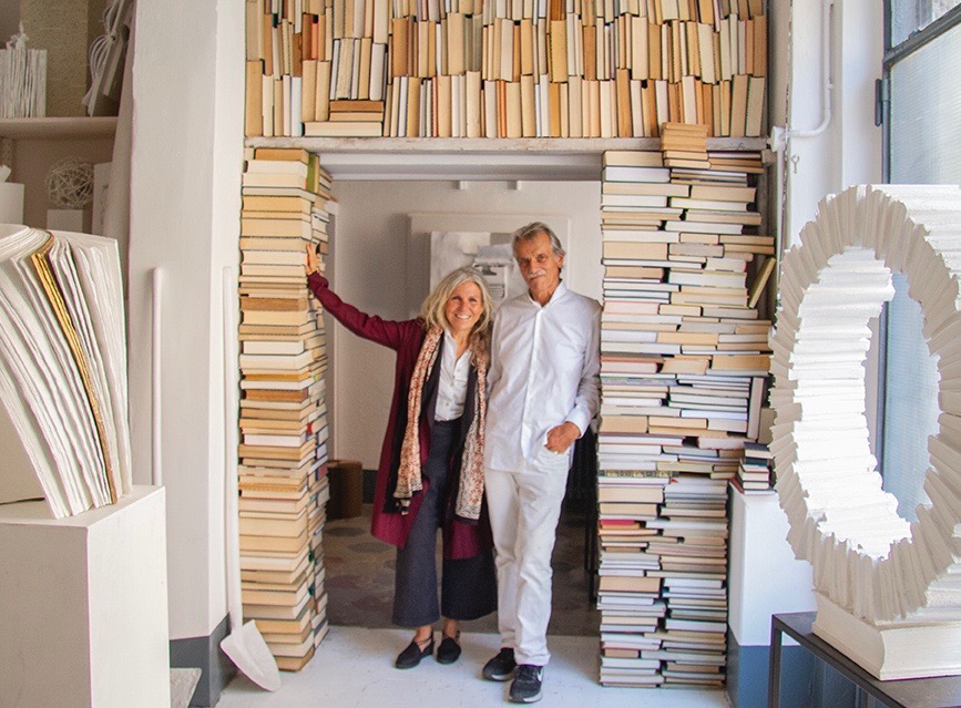 After a “small” interlude of 40 years in the advertising field, where I was never fully satisfied, I returned to my youthful passions: art, and the book, for me a timeless icon of knowledge that it still intimidates me today, but that, as you say, is my obsession. Hence the choice to use it as a raw material, covered with white that makes it an icon, an archetype.