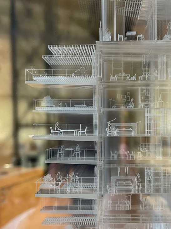 NL — People need at the same time a lot of privacy and the opportunity to meet their neighbours. That’s why in our buildings, the ones I design, I often put common spaces: you meet your neighbours, you can work in these spaces because as we know, people telework a lot now. They can also have children in their apartments and I think it is very important that architects think about this new way of life, and propose spaces to materialize it.