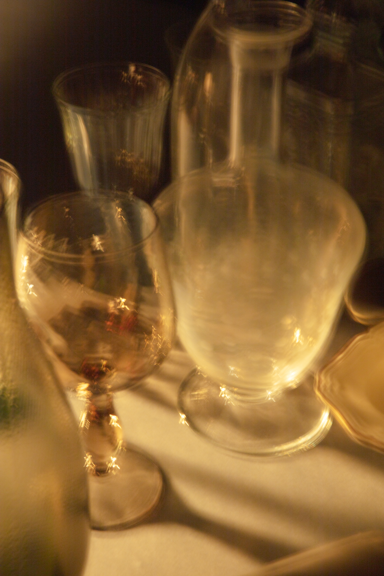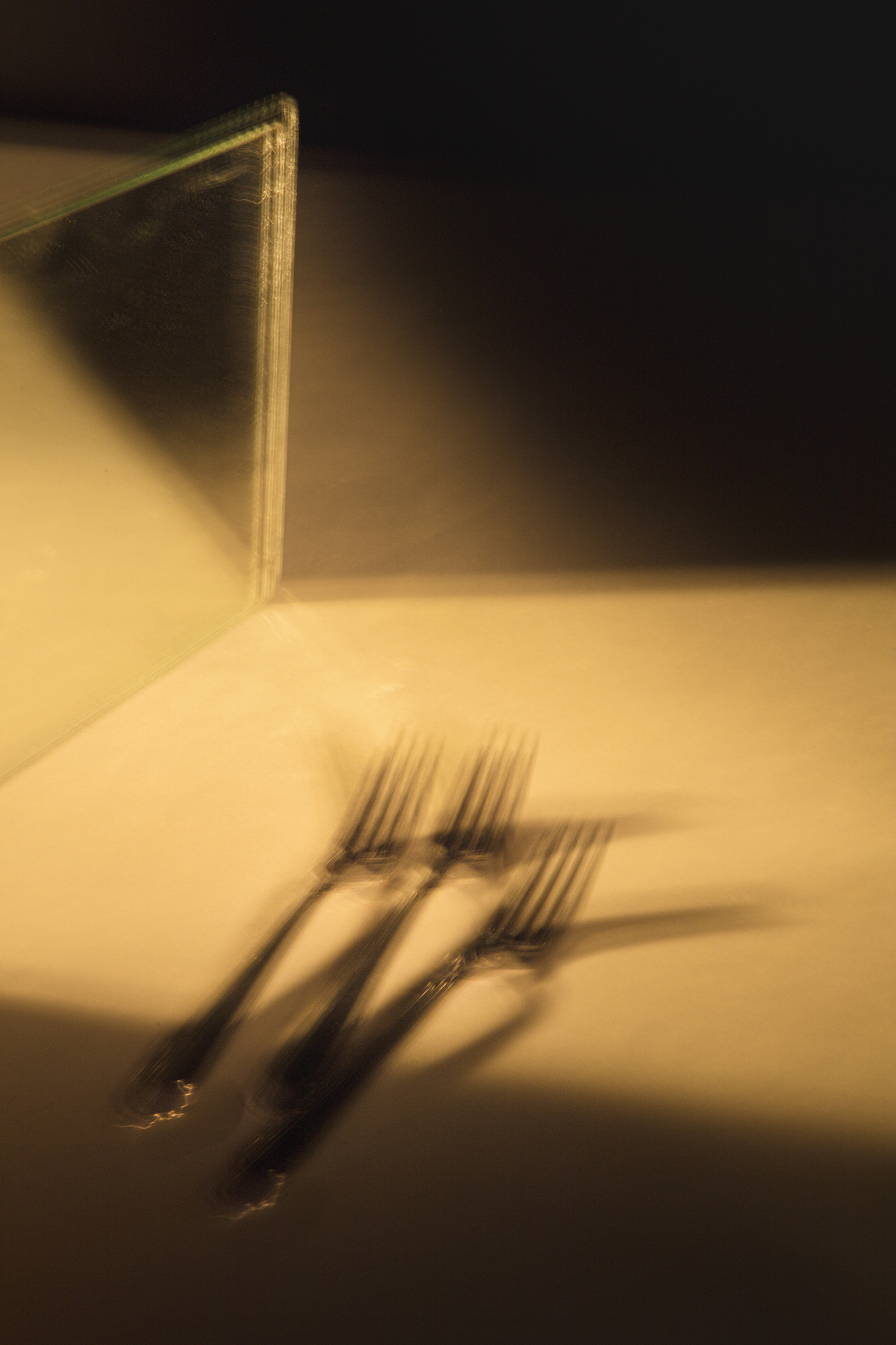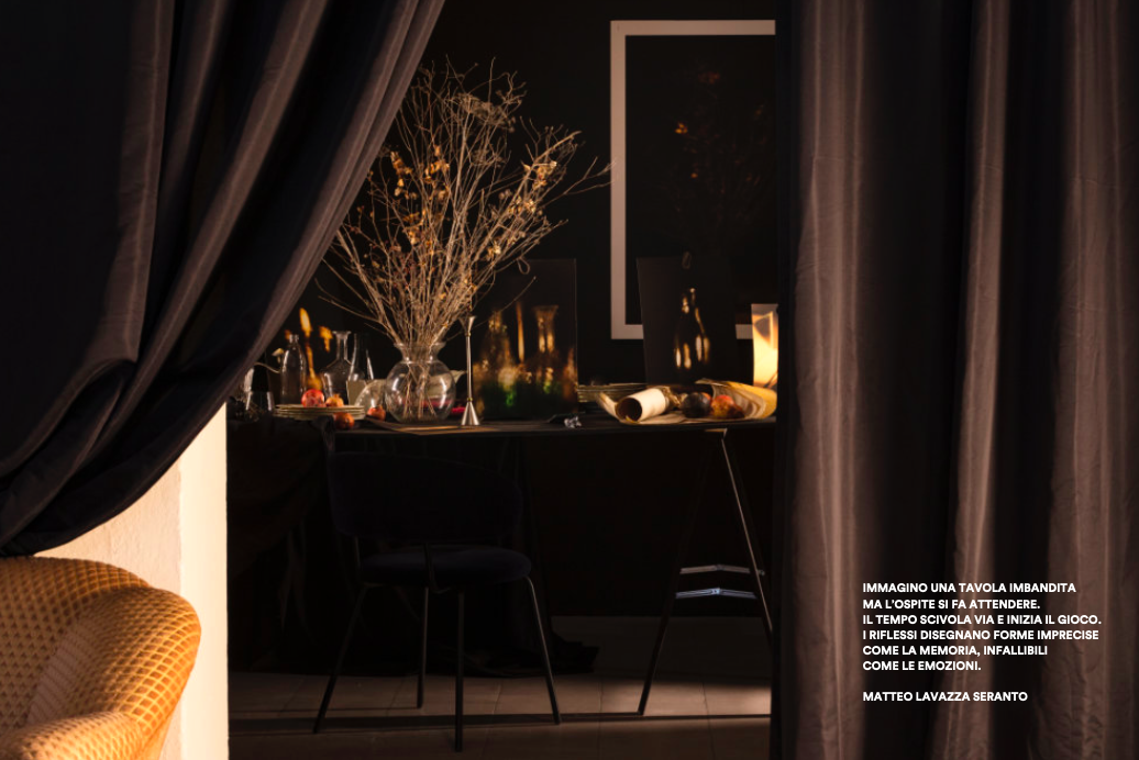 MLS – Questa installazione che è una sorta di galleria fotografica è un’ode alla memoria, allo spazio del tempo che si dilata o si restringe. A seconda delle proprie necessità. Io vedo un’intercapedine tra passato e futuro. Questa tavola imbandita si anima e genera immagini statiche di quanto potenzialmente è accaduto o avrebbe potuto accadere intorno ad essa. Il teatro sicuramente è una fonte di ispirazione molto forte, l’intento è quello di immedesimazione di un teatro povero fatto di pochi oggetti. Un teatro alla Peter Brook, dove il gesto si espone nudo. E poi i grandi maestri del “set up” fotografico come Sheltens & Abbenes, Jan Goover, André Kertész.
