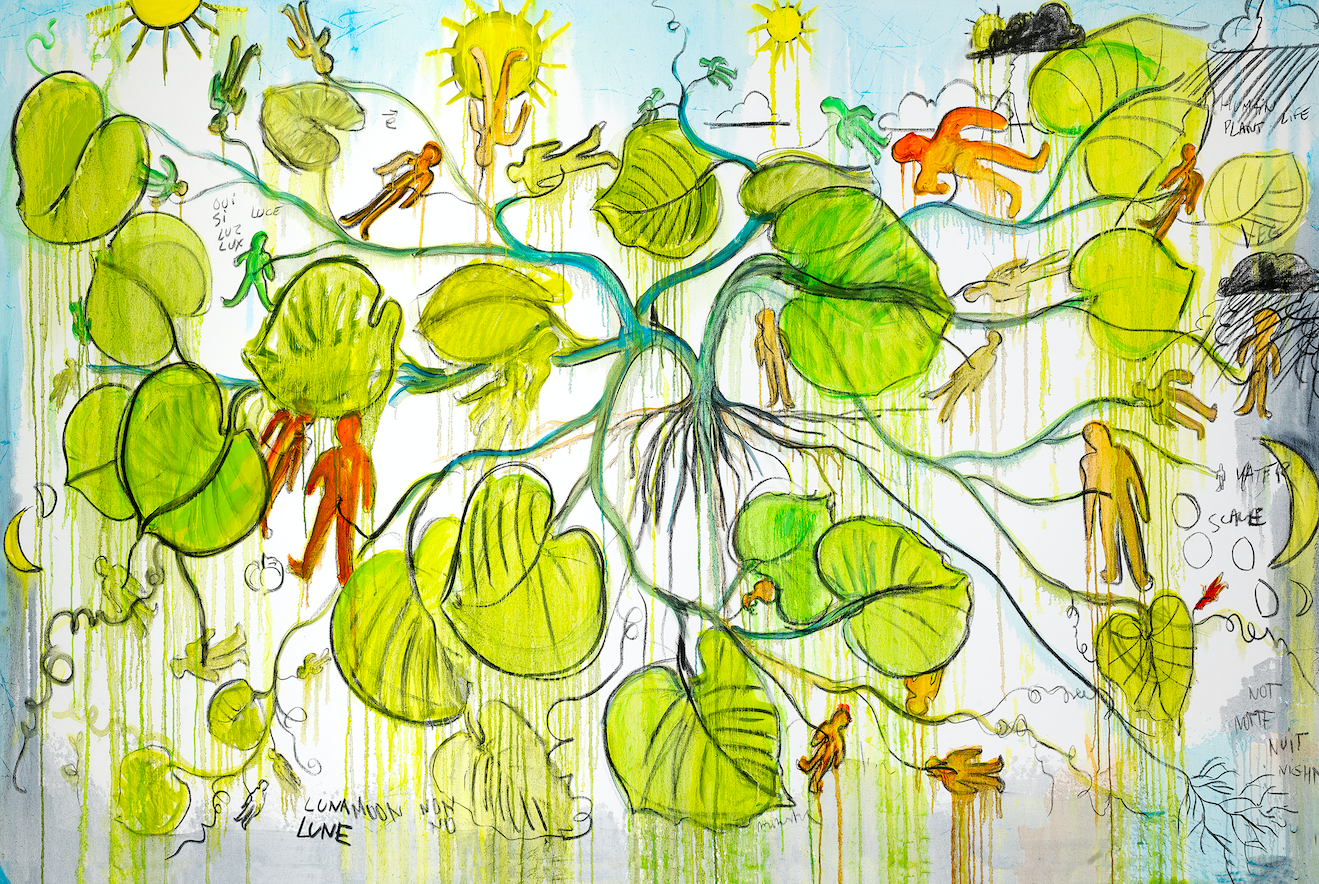 Hyber portrays on the wall the cycle of life in which nature and man are part of the same biotype.