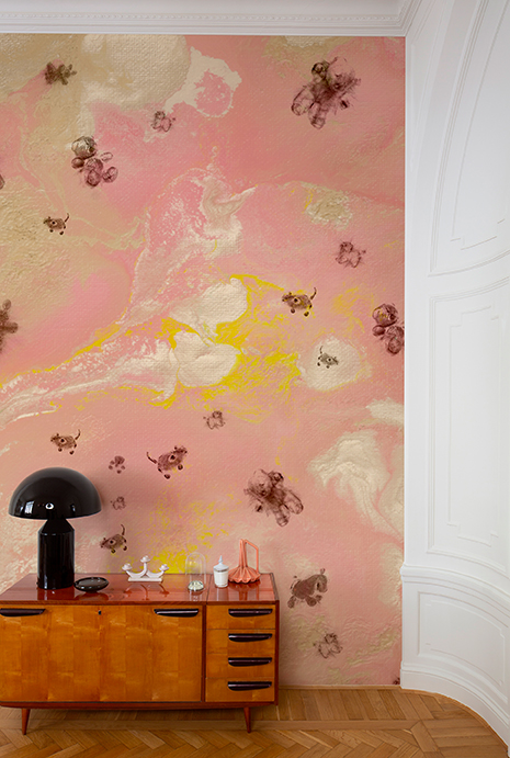 When Jimmie Durham, one of the Founders of LABINAC, died on November 17th in 2021, the idea of working on a wallpaper was already in the air but, despite the immeasurable loss that this event brought inside the collective, the group of designers never thought of interrupting the creative path they had begun together. On the contrary, they continued to carry on the investigations which had already commenced on this project based on the work done up to that moment. They therefore started from the original sketches: graphic powder prints that Jimmie had made with stuffed animals that were transported onto paper convey a vivid expression of the inner narratives that this visual imagery represents, somewhere between comfort and dreams. The activity in the background – the result of a collective painting process – colourful, fluid, lively, works on the variations of abstract spaces that fix no narratives but instead encourage further dreams.