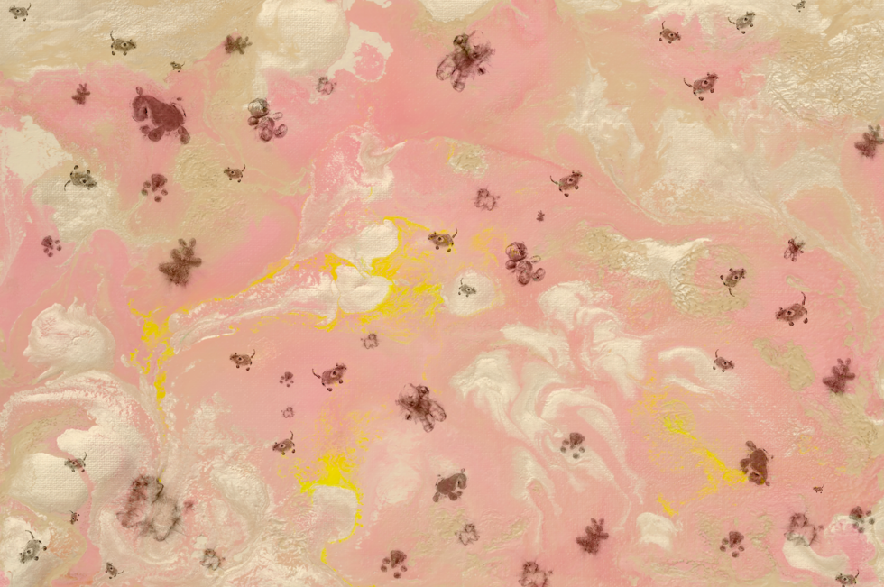 When Jimmie Durham, one of the Founders of LABINAC, died on November 17th in 2021, the idea of working on a wallpaper was already in the air but, despite the immeasurable loss that this event brought inside the collective, the group of designers never thought of interrupting the creative path they had begun together. On the contrary, they continued to carry on the investigations which had already commenced on this project based on the work done up to that moment. They therefore started from the original sketches: graphic powder prints that Jimmie had made with stuffed animals that were transported onto paper convey a vivid expression of the inner narratives that this visual imagery represents, somewhere between comfort and dreams. The activity in the background – the result of a collective painting process – colourful, fluid, lively, works on the variations of abstract spaces that fix no narratives but instead encourage further dreams.