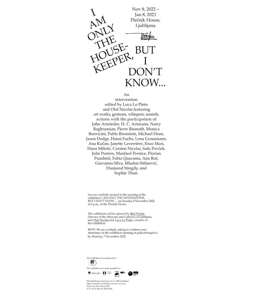 La mostra si intitola “IO SONO SOLO LA GOVERNANTE, MA NON LO SO…”, e dura fino al 9 gennaio 2023. Si comincia così, con una finta lettera di un’altrettanto ipotetica governante della casa di Plečnik: in realtà una dichiarazione d’artista, quella dei due curatori, Olaf Nicolai e Luca Lo Pinto.