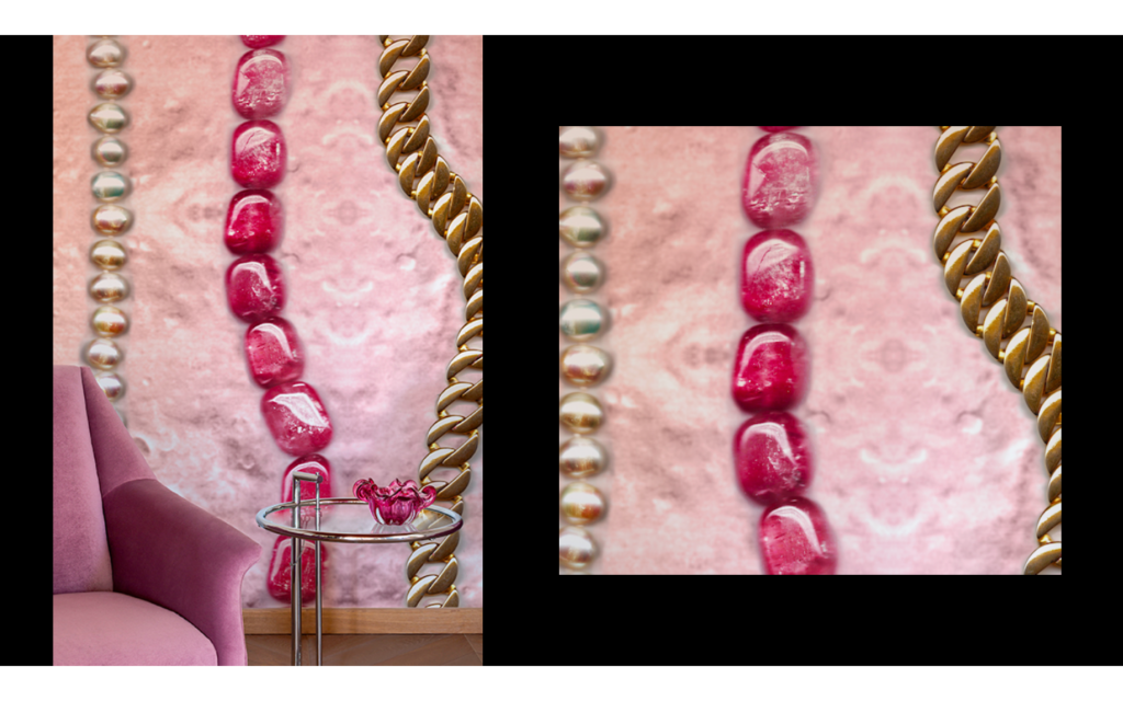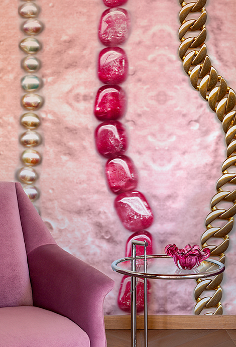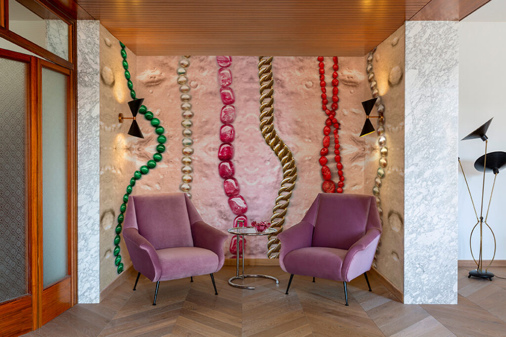 The necklaces stand out imposingly against the extraterrestrial ground and mark the space vertically with shapes, reflections of light and colour. A handful of golden threads and stones polished by time symbolise intimacy, emotional closeness, the warmth of family and make us feel “at home”.