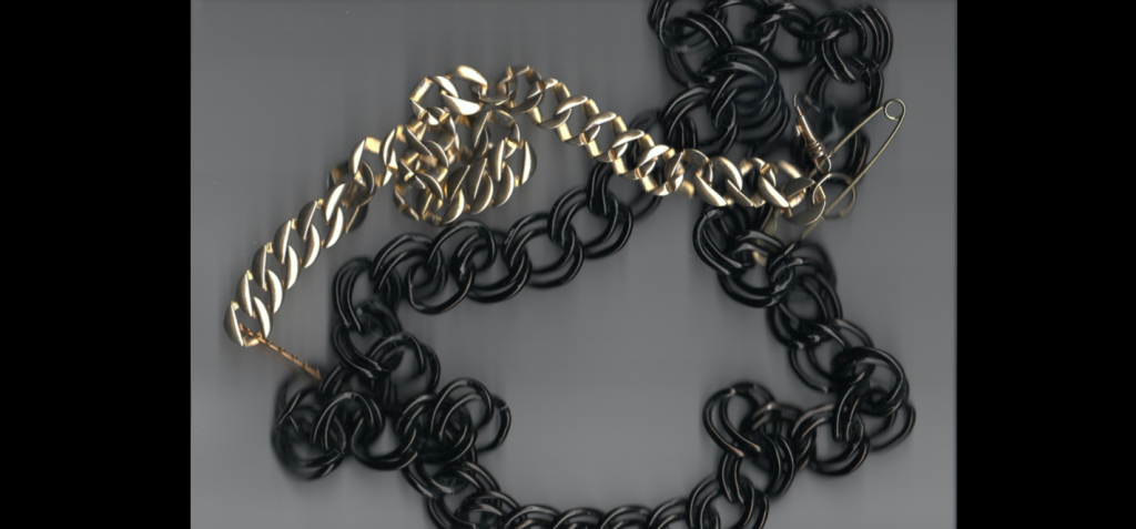 Le collane si stagliano imponenti sul suolo extraterrestre e scandiscono lo spazio verticalmente con forme, riflessi di luce e colore. Un pugno di fili d’oro e pietre levigate dal tempo simboleggiano la vicinanza affettiva, il calore della famiglia e ci fanno sentire “a casa”.