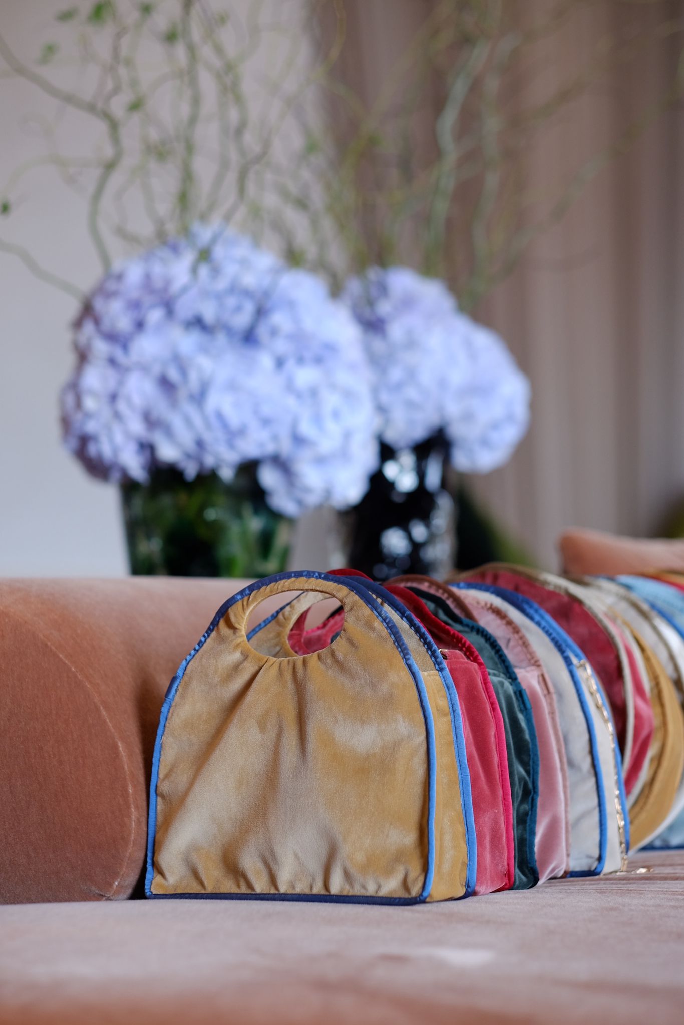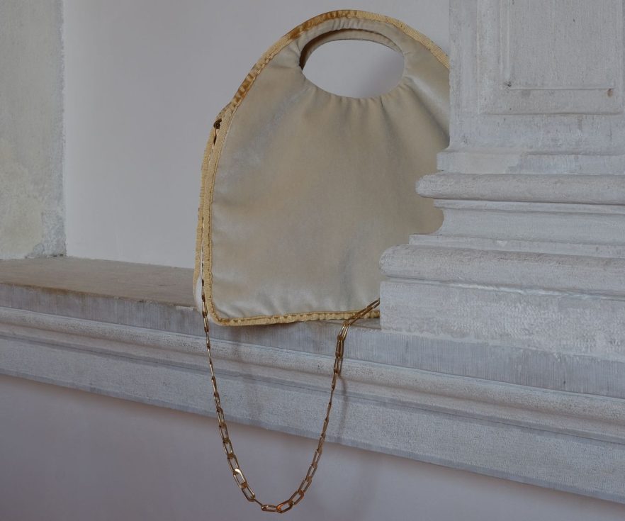 GC / GS – We met in Venice, its colours and its history inspired the idea of creating a line of elegant and essential bags, simple but well conceived, using velvet derived from recycled plastic as materials, strong silken trimming on the edges, different fabrics with original patterns for the interiors, designing radical yet sinuous shapes and proportions, which often refer to Venetian architectural styles.